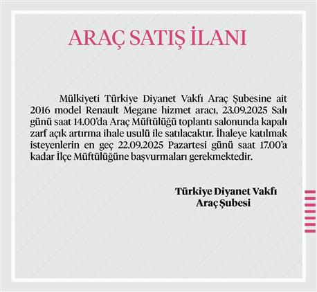 TÜRKİYE DİYANET VAKFI ARAÇ ŞUBESİ HİZMET ARACI İHALE USULÜ SATIM İLANI