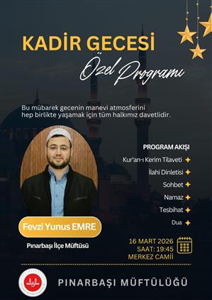 İlçe Müftülüğümüzün düzenlemiş olduğu Kadir Gecesi Özel Programına tüm halkımız davetlidir.