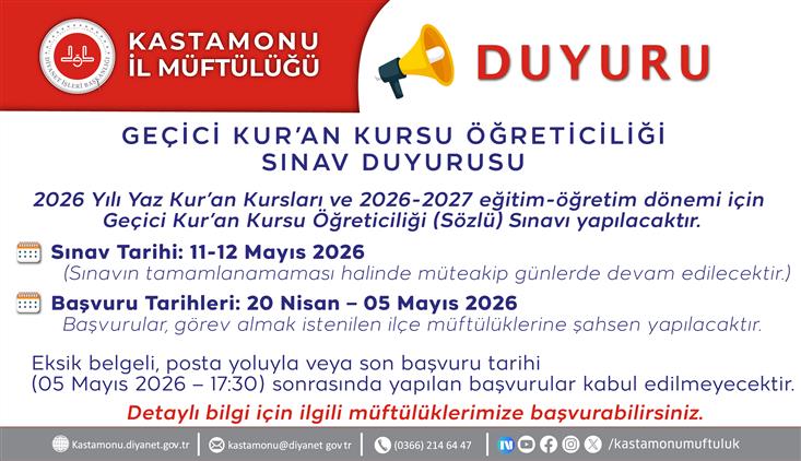 2026 yılı Yaz Kur’an Kursları ve 2026-2027 eğitim-öğretim dönemi için Diyanet İşleri Başkanlığı Atama ve Yer Değiştirme Yönetmeliğinin 10. maddesine göre ihtiyaç duyulan Kur’an kurslarında ek ders ücreti karşılığında, ilimize bağlı merkez ve ilçe müftülüklerinde görevlendirilmek üzere 11-12 Mayıs 2026 tarihlerinde (sınavın bitmemesi hâlinde müteakip günlerde) Geçici Kur'an Kursu Öğreticiliği (Sözlü) Sınavı yapılacaktır.